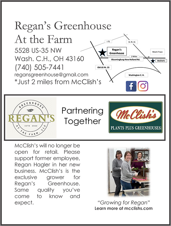 With great anticipation, we introduce and enthusiastically support Regan Hagler’s dream of opening her own retail greenhouse! “Regan’s Greenhouse at the Farm” will be located at her family farm barely 2 miles from McClish’s at 5528 US Rt. 35 NW, Washington C.H., OH 43160. Regan has conscientiously helped McClish’s completing 6 seasons, and continues to develop a keen eye for growing while welcoming and servicing customers. She will feature plants still grown by McClish’s that devoted customers have come to expect over the years. Her family and friends have done a tremendous job converting the picturesque farm setting into an inviting adventure for gardeners to enjoy a newly erected greenhouse facility. McClish’s will bringing their plants to Regan’s location to allow all their previous customers to continue to enjoy the quality their customers have come to expect while allowing Regan to begin her greenhouse business journey.
